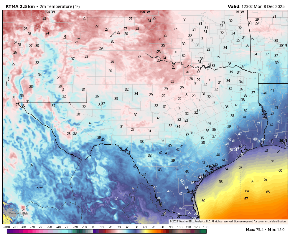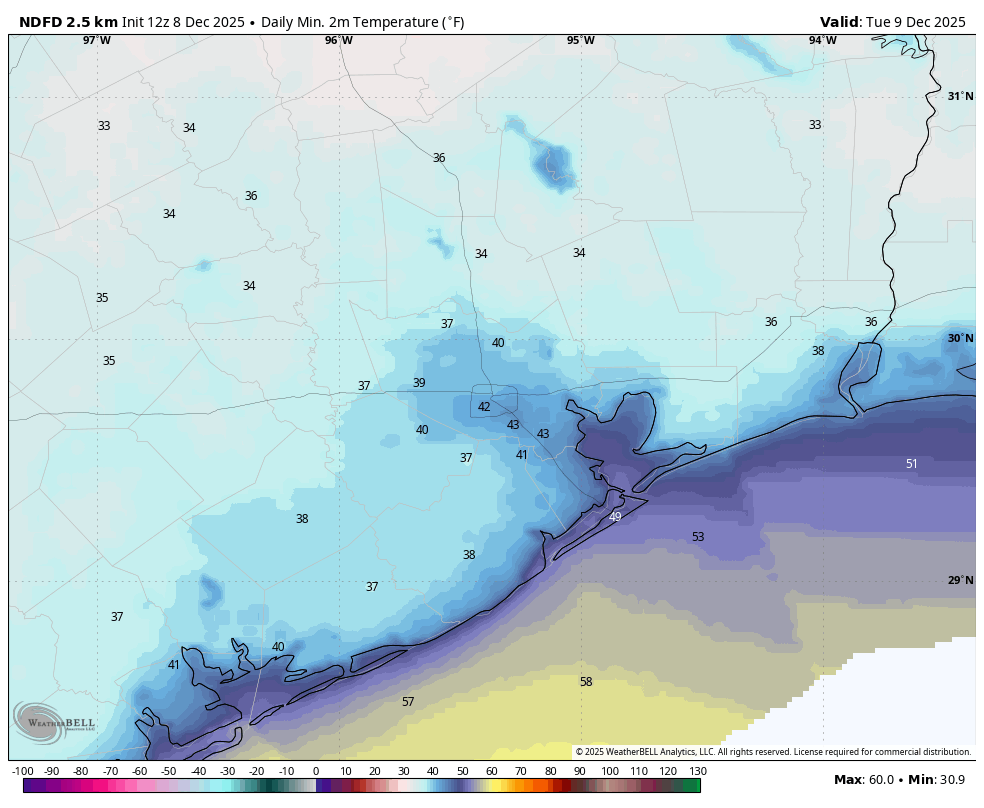 We should see numerous 40s everywhere on Monday and then 40s with many upper-30s peppered in on Tuesday morning. Tuesday’s record low of 32 degrees seems comfortably safe for Houston, but a few spots could push the freezing mark well outside of the Metro area. Highs on Monday may not even get much past 60 degrees in spots. Time to get up the Christmas lights.