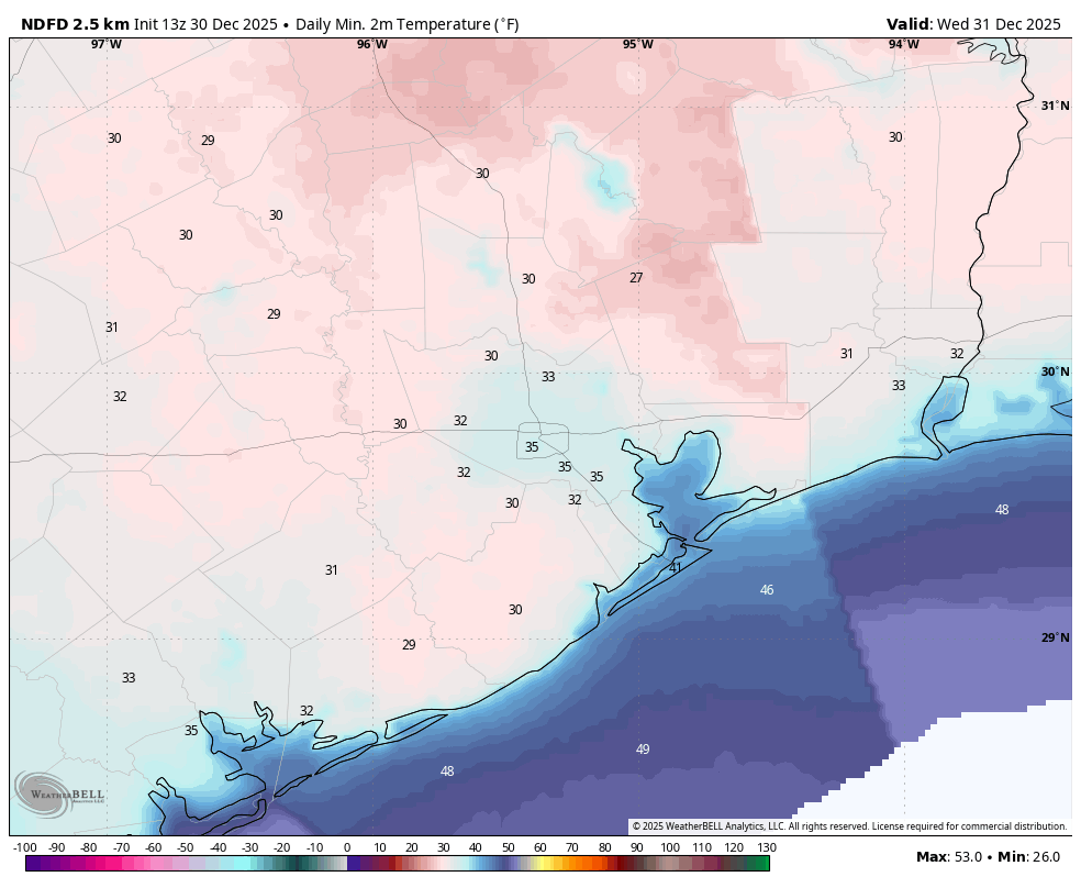 Temperatures are comfortably above freezing this morning across the Houston metro area, but what about tonight? We are going to see ideal conditions for heat to radiate back into space this evening, including clear skies and light winds. This will bring a light freeze into the Houston region. My sense is that urbanized parts of Houston and coastal areas will remain just above 32 degrees, but that inland areas and outlying suburbs, such as Katy, probably will briefly freeze tonight. Essentially, if you experienced freezing conditions back on Dec. 15, there is a decent chance you will again tonight. These temperatures are not cold enough to affect pipes or anything like that, but do take care of sensitive plants and pets.