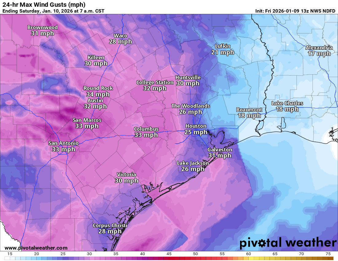 Winds: I’m sure more than a few of you stepped outside into the blustery conditions today and wondered whether these winds are going to persist into Sunday morning. We can confidently say no, they will not. As we’ve been predicting for several days, winds will be elevated in the aftermath of the frontal passage, but gradually settle down. Wind gusts of up to 20 mph will be possible until around midnight tonight, but then should die down. During the race on Sunday morning I expect very light winds at the start while we’re waiting in the corrals. By mid-morning (you know, probably right about the time you hit mile marker 14 and head north on Post Oak) they may pick up to about 10 mph, with some slightly higher gusts from the north. Still, they’ll be nothing like last year.