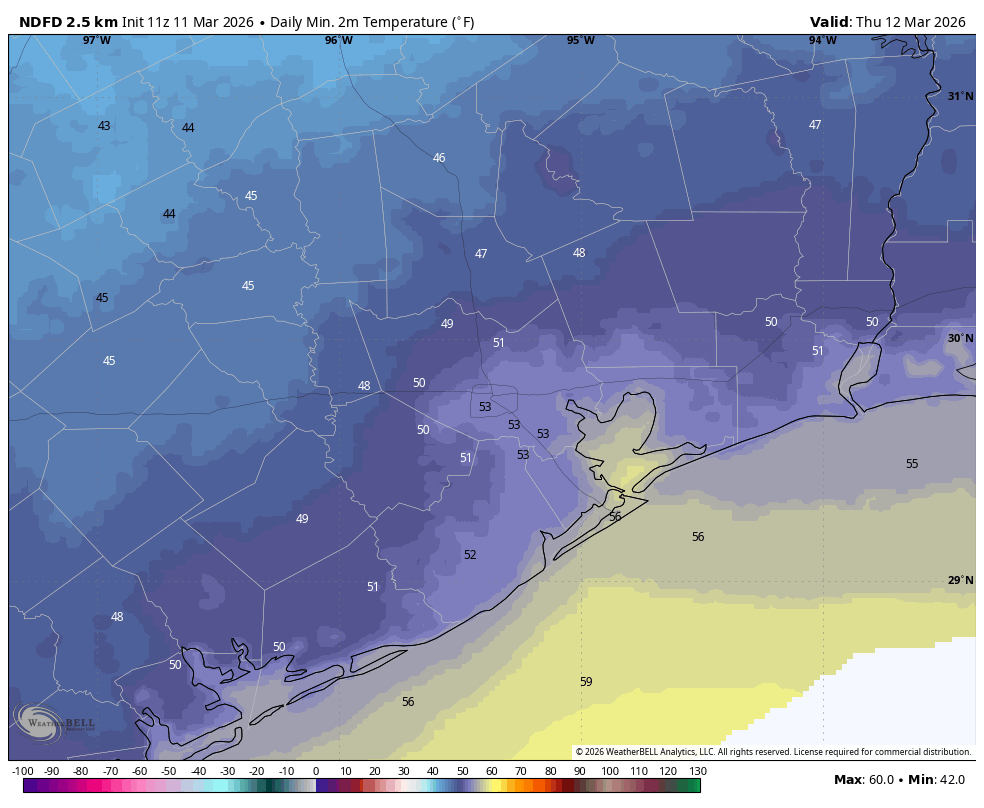 I’ll have more on this tomorrow, but Sunday’s front could usher in some significantly cooler air, with a few nights in the lower 40s in Houston, and possibly even upper 30s for more rural locations. We’ll have to wait for details, however, as I want to see a little more consistency in the models before hazarding a firm forecast.