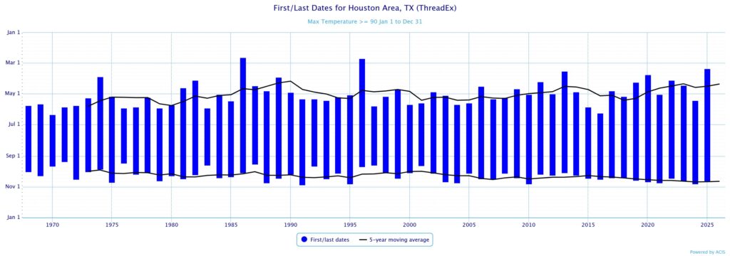 Warm temperatures, with highs near 90 degrees, will continue into next week. Some sort of front may work its way into Houston by Tuesday or Wednesday, but your humble forecaster is making no concrete predictions on that score. We’ll have to see what happens.