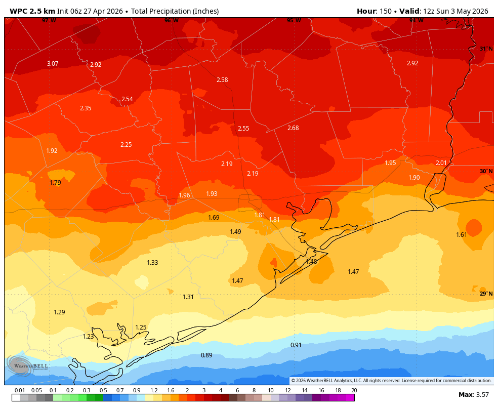 Both weekend days should see a mixture of sunshine and clouds. It remains to be seen whether lingering instability and daytime heating can spark any showers or thunderstorms. My sense is probably not, but it will be something to consider should you be outdoors on the MS 150 ride. Be aware of your surroundings. Otherwise, high temperatures should approach 90 degrees on Saturday, and quite possibly reach it on Sunday for large parts of Houston. Winds will be from the south, gusting up to 20 mph or so during the afternoon hours. Overnight lows probably will only reach the lower 70s.
