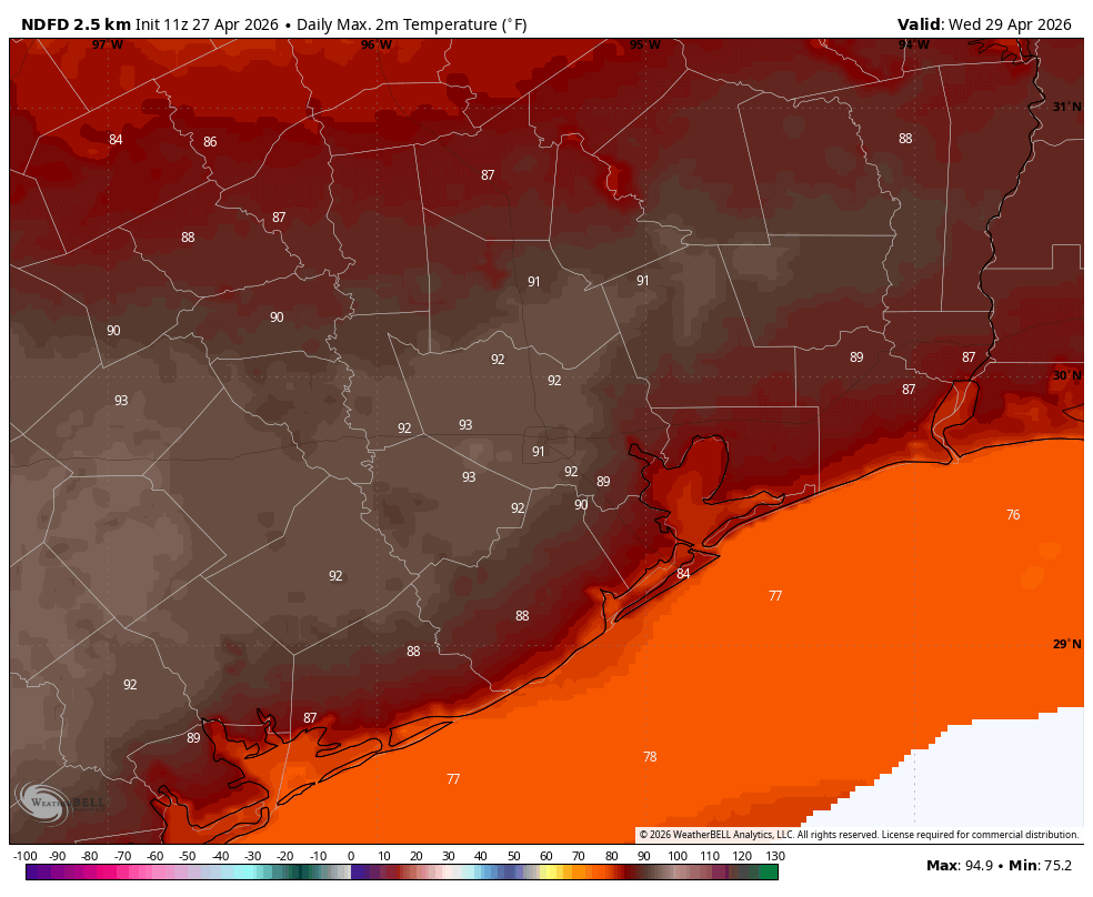Yes, a few spots in Houston have already hit that mark this year, but officially the region’s hottest day came on March 21 when the high temperature at Bush Intercontinental Airport reached 88 degrees. So far, our average high temperature this month has been below 80 degrees. The bottom line is that, after today, Houston is going to experience is longest, and hottest period so far of the year, as well as a foretaste of what is to come next month and beyond as summer slides into the region.