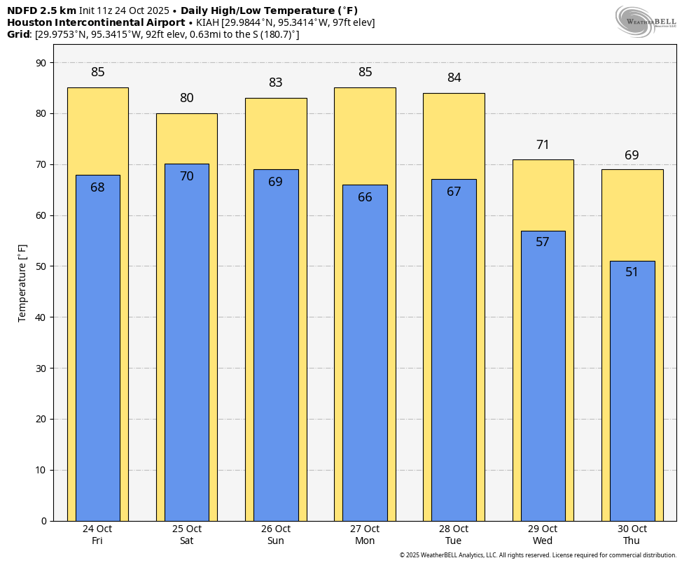 Monday and Tuesday should be slightly warmer days, with highs in the low- to mid-80s. However, a front with more cold air behind it looks set to arrive on Tuesday, and this will usher in decidedly fall-like weather for the remainder of next week. (Probably not much, if any, rain with this front). We are talking a few days of highs in the 70s (Thursday might even top out in the 60s) with nights probably in the 50s through the weekend. Halloween, for the most part, looks to be clear and cool for your trick-or-treating desires. Ideal weather on Halloween in Houston? It’s been awhile.
