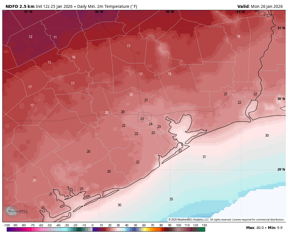 With mostly cloudy skies we should see low temperatures tonight drop into the 20 to 25 degree range in Houston. Ongoing northerly winds at 15 mph, with higher gusts, will add additional chill to the air. Please protect pets from this very cold weather tonight.