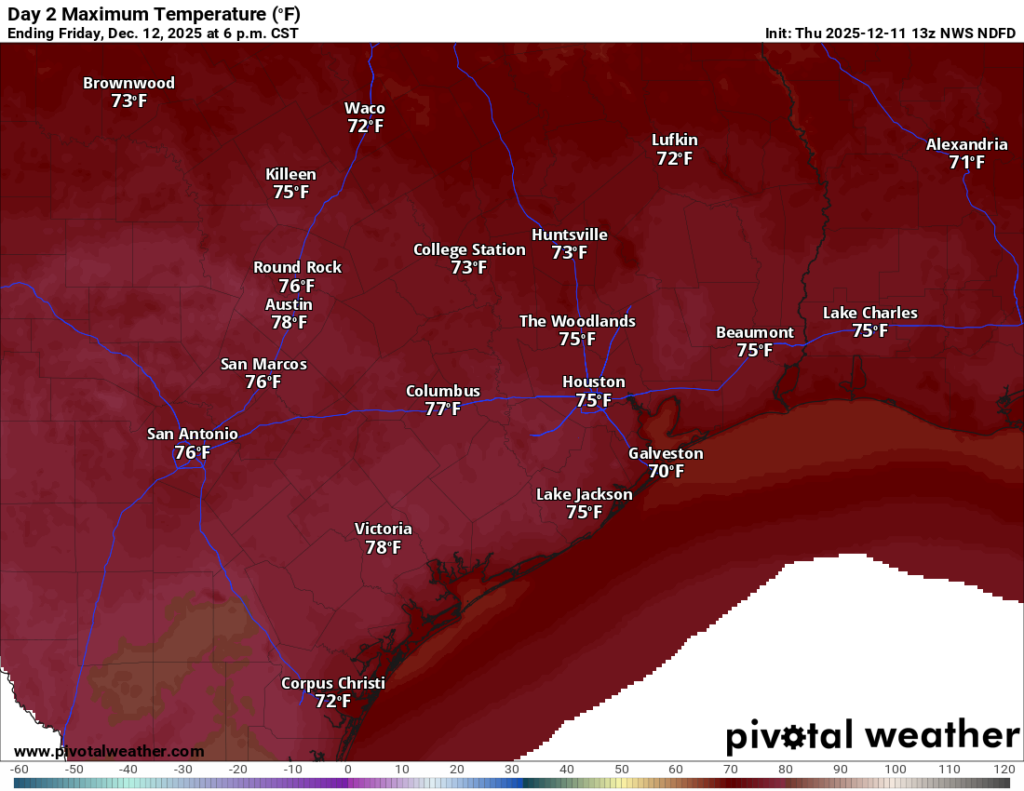 In brief: A lovely day today in Houston will give way to a warm up tomorrow and fog and shower chances on Saturday. Our next front Sunday morning may knock temps back close to freezing in spots on Monday morning before we begin what could be a prolonged, serious warm up leading into Christmas.