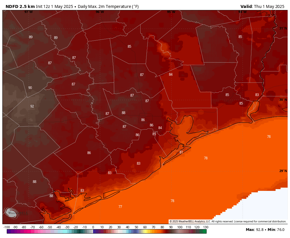 If April seemed rather warm, you’re not wrong. The month ended last night, and for the greater Houston region it was a seasonably sizzling one. The city’s average temperature was 74.6 degrees, which is nearly 5 degrees above normal. This ranks as the fourth warmest April of all time in the city’s history. One reason is that the city saw no real fronts during the second half of the month. But that does not mean summer has quite yet arrived in Houston. A modest front will reach the city this weekend, and another one is possible about 10 days from now. These won’t be strong fronts, as such things are rather rare for May. But any dry air this late into the spring season is welcome.