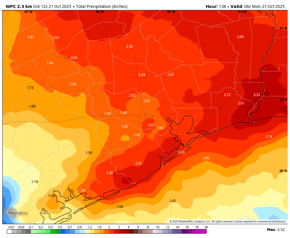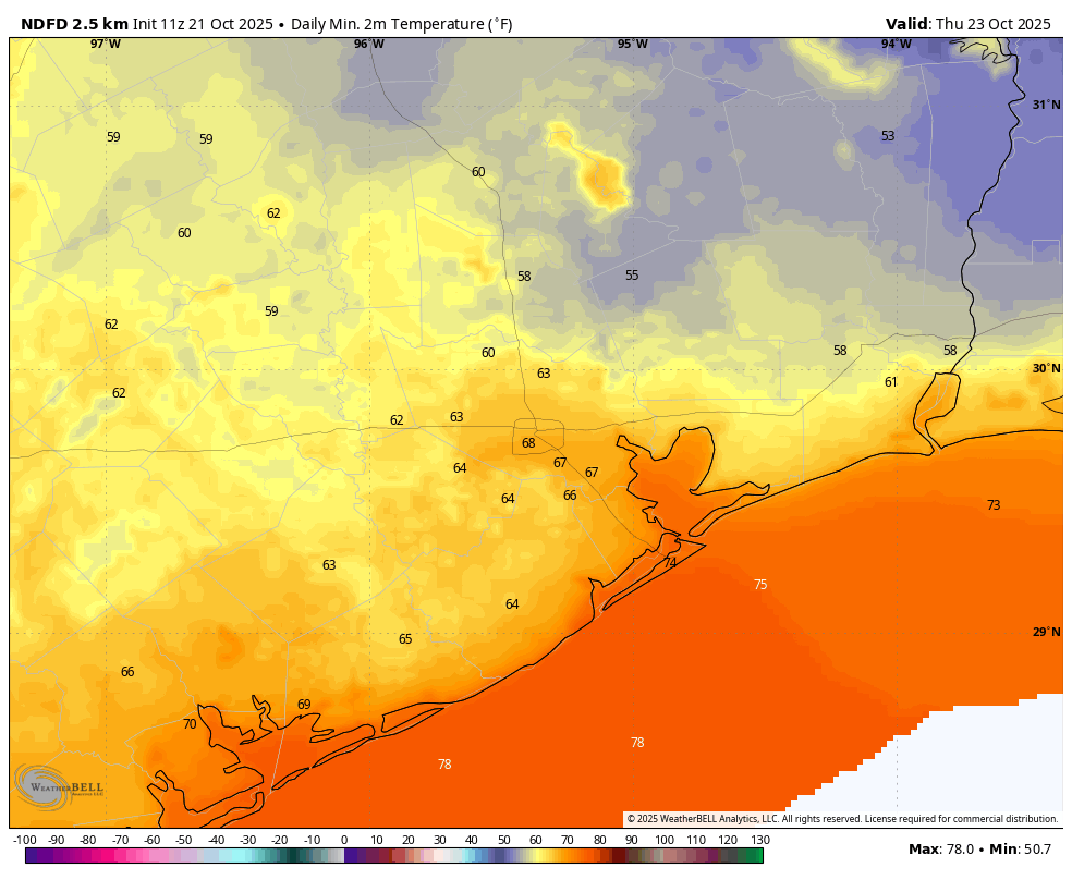 We’re going to see another partly to mostly sunny day today, with high temperatures likely reaching 90 degrees for most of the region. (There’s a non-zero chance this is our final 90-degree day of 2025, but I don’t want to jinx anything so pretend I did not write that). A weak front will arrive later today, and it will bring a slight chance of showers and isolated thunderstorms with it. The best chances will be east and southeast of Houston, particularly in areas near Galveston Bay, this afternoon and early evening. The front will usher in some drier air, and lows tonight will drop into the upper 60s in Houston, with cooler conditions for outlying areas.