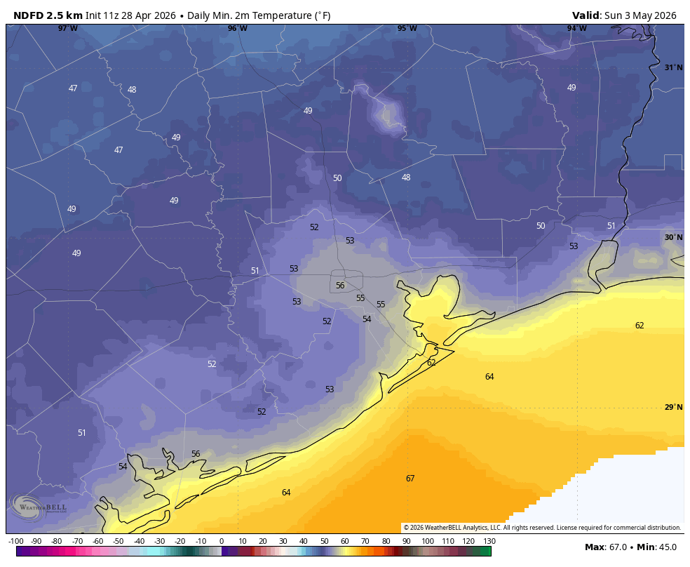 There is a lingering chance of rain on Saturday morning, but I am hopeful that showers will end before the weekend really gets going. That’s another way of saying, if you have outdoor activities planned for Saturday don’t not abandon hope yet. Saturday will start out cloudy and breezy, with northerly gusts up to 25 mph. By the afternoon hours, however, we could start to see some clearing of skies. Lows on Saturday night look chilly, possibly dropping into the mid-50s in Houston, with cooler conditions for outlying areas. We shall see.