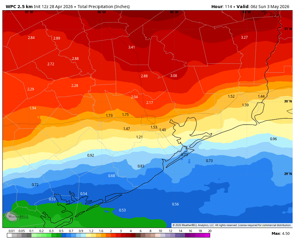 Anyway, although storms are somewhat unlikely today, they’re possible, and chances are a little higher on Wednesday. So be prepared for inclement weather (i.e. damaging winds, hail) even if it is fairly unlikely. Our best chance of rain will come on Friday, when a front advances toward, and then moves through Houston. Most of the region should pick up 1 to 2 inches of rain this week, with some areas north of Interstate 10 likely seeing more.