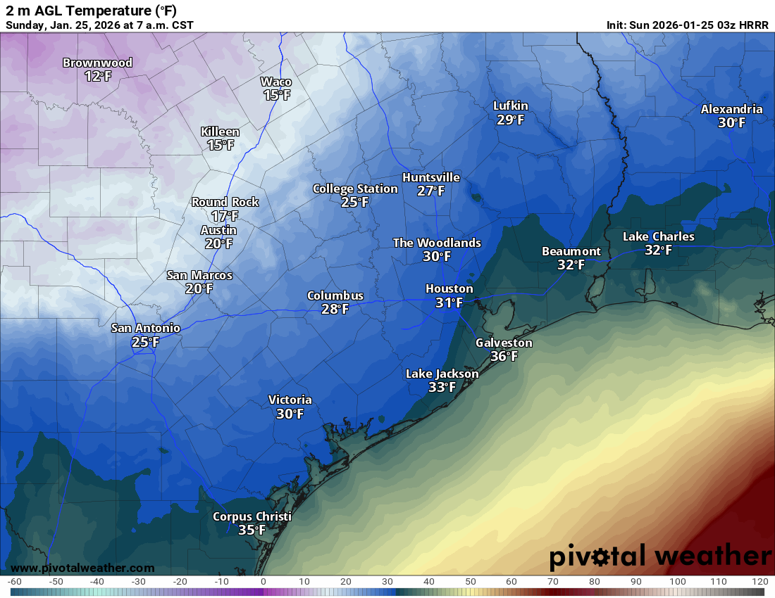 Winds will be blustery on Sunday. Expect gusts of 20 to 25 mph creating wind chills in the teens, especially in the afternoon. I am not optimistic that we’re going to see much sunshine tomorrow. In fact, the cloud cover may linger into tomorrow night helping keep temperatures milder than forecast, likely in the mid-20s in most of the metro area. We should see the sun return by Monday afternoon. With clearer skies, it’s plausible that Tuesday morning will actually be colder than Monday in Houston, not by a ton but at least a little bit. You’ll want to maximize your cold weather protections through Tuesday.