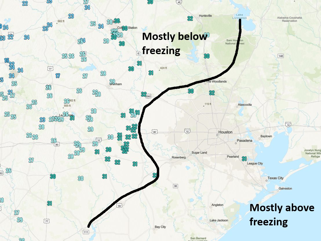 Temperatures will continue to drop, with the freezing line probably entering the western Metro area around 1 AM or so, the I-45 corridor north of I-10 around 3-4 AM, and the Inner Loop by 7 AM. Note that the freezing line will push farther south than it will east faster, so places like Bay City and Wharton will drop below freezing before places like Humble as an example.