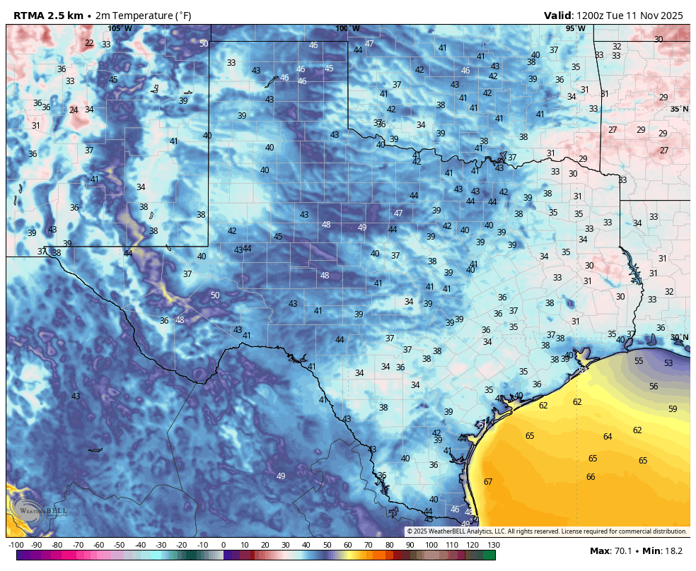 This morning’s post is a little bit late because I wanted to get a good read on just how low temperatures in the region went this morning. Although the numbers are not official yet, the city’s primary station at Bush Intercontinental Airport dropped to at least 37 degrees (the record minimum for today is 32 degrees, set in 1987). Some of the usual cooler spots, including Conroe, Cleveland, Brenham, and Navasota, all recorded a light freeze this morning, and the vast majority of the metro area dropped into the 30s, barring the immediate coast. In short, it’s rather chilly for early November. However this won’t persist. Last week we described this front and short and sharp, and temperatures will moderate quickly today.