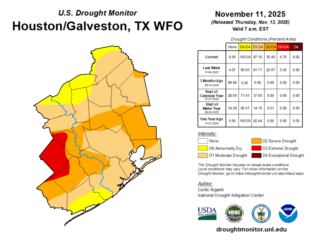 We continue to see extreme drought bubbling up west of Sealy and Wharton. So any rain will be welcome. Thursday’s front looks interesting on some model guidance in that it may have some element of severe weather risk. It’s too early to speculate much but the basic ingredients seem to be in place. Bottom line? Expect a cold front on Thursday that could perhaps be accompanied by some noisy thunderstorms and locally heavy rain. More to come.