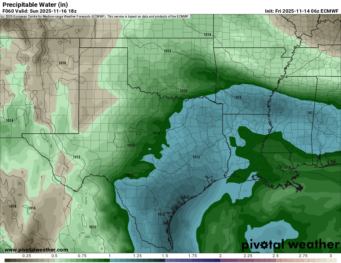 We really dig in on the humidity here. That may be the only thing that prevents us from hitting the upper-90s. Gulf moisture starts to pool over the area, allowing dewpoints to push closer to 70° at times, while precipitable water, or the amount of available moisture in the atmosphere goes from about 1 inch or so on Sunday to 1 to 1.5 inches Monday to 1.5 to 1.75 inches Tuesday.