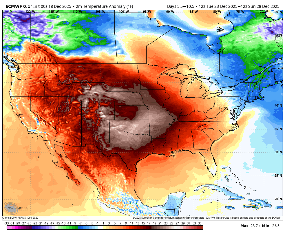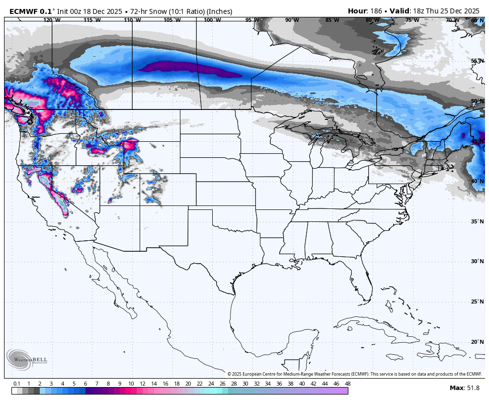 Will anyone in the Lower 48 have a White Christmas this year? Only a very few areas will be cold enough and wet enough due to a large ridge of high pressure establishing itself over the United States. Here’s a map showing 3-day snowfall totals preceding Christmas morning. Unless you live in the Pacific Northwest, Sierra Nevadas, Rockies, the upper Upper Midwest or New England area, you’re out of luck.
