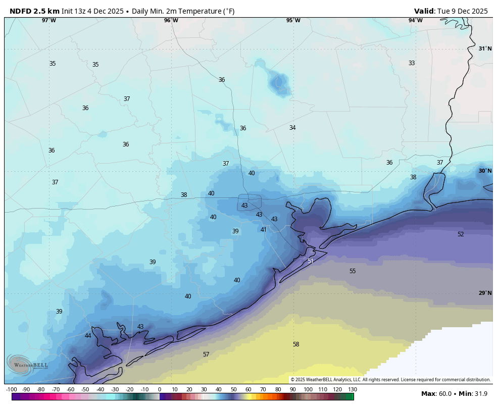 I think we’ll probably see a lull in rain showers on Thursday night (not completely, but for the most part), however we could see the return of some additional light rain on Friday. These would be nuisance showers (i.e. one to two tenths of an inch, at most) rather than anything that will cause problems. However, with high temperatures likely peaking in the low 50s for much of Houston, this will add to the feeling of cold and dreary conditions. Rains should end completely by Friday evening, with lows dropping into the 40s area wide.