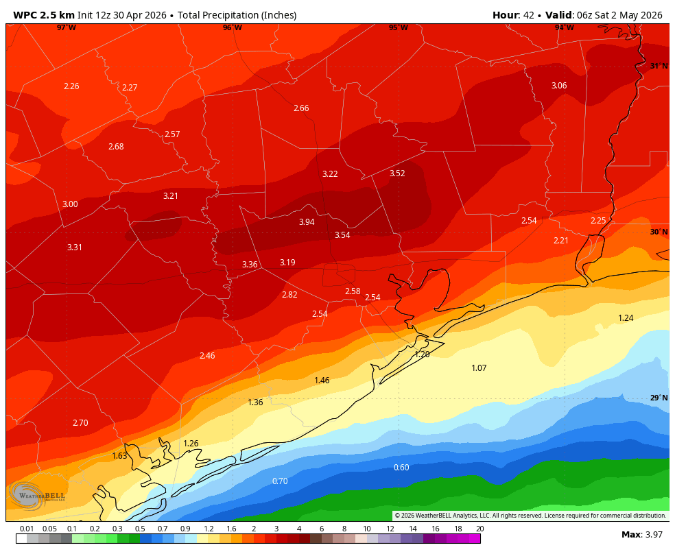 The much discussed cold front will essentially stall over the Houston metro area on Friday, and this will serve as a focus for showers and heavy rainfall. (There is a very slight chance for severe weather, such as damaging winds and hail). There remains some uncertainty as to where the heaviest band of rainfall will set up, it could be along the Highway 59/I-69 corridor, or a little north or south. But we do feel like somewhere is going to see 2 to 4 inches, with higher amounts possible. Generally we expect most of the region to pick up 1 to 3 inches. This potential for rainfall will persist into the evening Friday before the front finally pushes off the coast.
