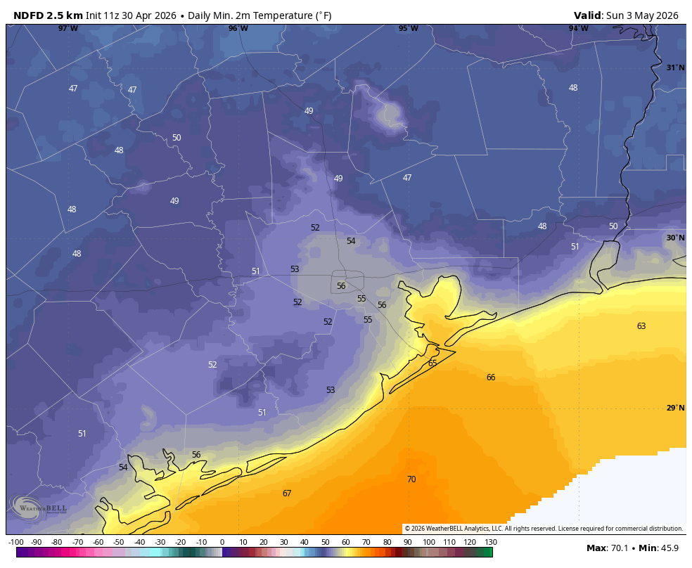 Although some clouds may linger on Saturday morning, we now pretty much expect wall-to-wall sunshine for the weekend. Saturday’s highs may peak around 70 degrees, whereas Sunday reaches the mid-70s. Friday night and much of Saturday will be quite breezy, with southerly gusts reaching 25 or even 30 mph (especially along the coast). These winds should die down by Saturday afternoon or evening, so Sunday looks placid in this regard. Lows on Saturday night should again drop into the 50s, with the potential for upper 40s for far inland areas. Both Saturday and Sunday will enjoy low humidity. This is a really nice cold blast for early May, so enjoy it before summer arrives!