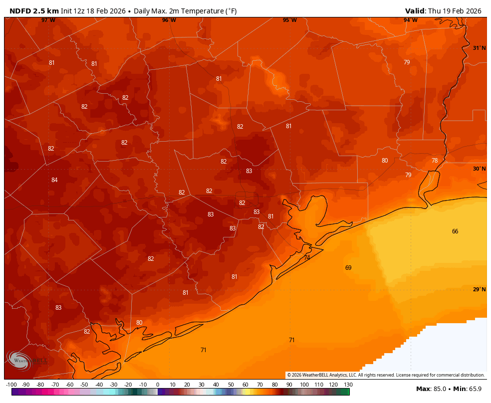 These two days will be similar in Houston, with highs in the lower 80s for the most part. Our daytime temperatures will depend on afternoon cloud cover. Each of these days will also have a low chance of light or misty showers, although again I would not anticipate anything in the way of accumulations. Fog chances will continue through Friday night.
