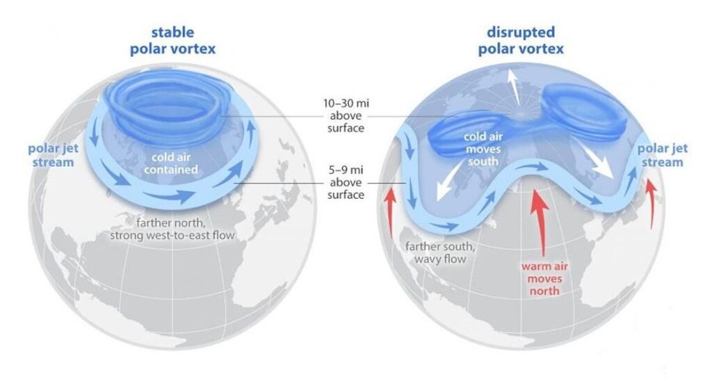 Essentially, Arctic air had the opportunity to finally move further south into North America this winter. There is this big mass of cold air that sits over the North Pole called the polar vortex, which is held in place by a ring of fast-moving winds called the polar jet stream. When there are rapid temperature changes in the Arctic, along with a number of other factors, we see waves start to form in the polar jet stream. As this happens the polar vortex is disrupted, causing polar air to spill southward. This produced the rapid temperature drop experienced by the region during the last 10 days of January.