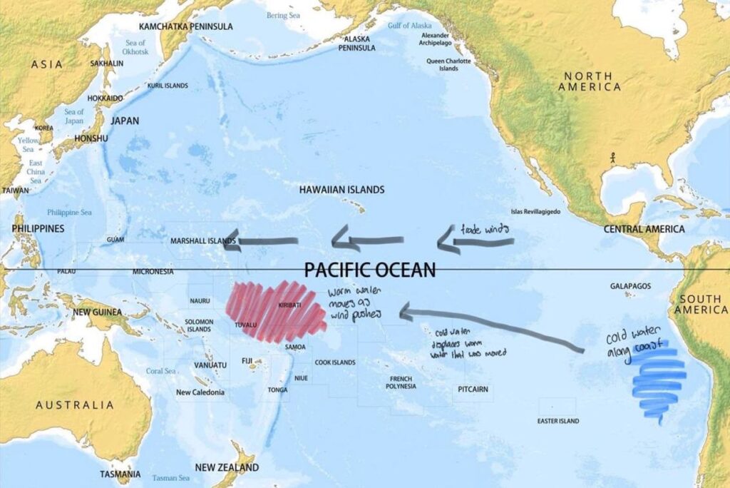 Now when we see a La Niña pattern, like we are presently experiencing, the trade winds are even stronger, which means more warm water is being moved, and more cold water is being displaced to fill it in (more upwelling). For us in North America this means that our side of the Pacific is colder than normal, which can affect the whole continent’s climate.