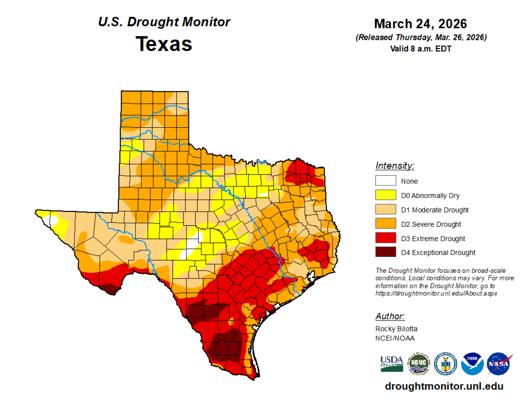 For the greater Houston area the problem has been building this winter, but until recently was not acute. As days lengthen and warm up, that is now changing, and areas of ‘severe’ and an even worse category, ‘extreme’ drought now encroaching upon Harris County. Much of Chambers, Waller, and Fort Bend counties now find themselves in an ‘extreme’ drought.