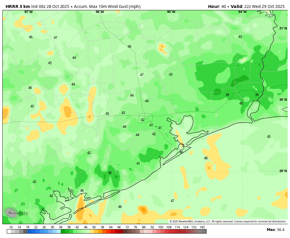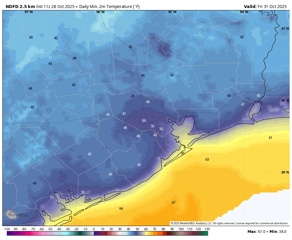 This will be a sunny and windy day. I expect winds to peak during the afternoon, when gusts could briefly reach about 40 mph, especially closer to the coast. Highs, otherwise, are likely to top out in the upper 60s. Lows on Wednesday night will drop to around 50 degrees in Houston, with cooler conditions for outlying areas. This will be our region’s coldest night in more than 200 days.