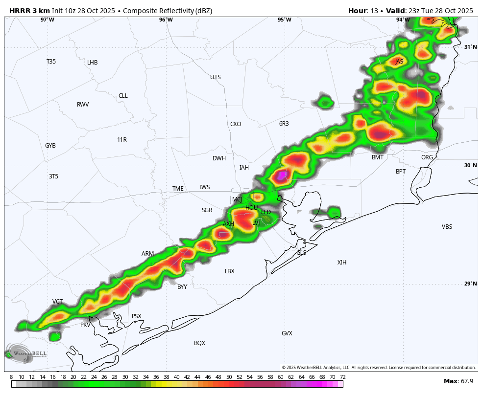 The front will be moving quickly so flooding is not a concern, but there will be a brief period when damaging winds and potentially hail are a threat as the front pushes through. In terms of timing, I’m thinking 3 to 5 pm for a line from Katy to the Woodlands, an hour later for central Houston, with the front likely off the coast between 6 and 8 pm.