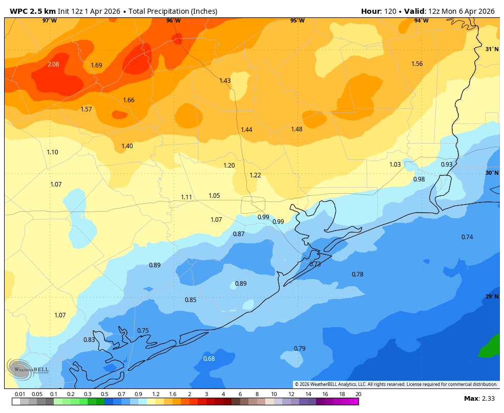 Alright, back to local weather. There won’t be much change over the next three days so I am lumping them together. We are going to see continued warm weather, with daytime highs in the range of the mid-80s, plenty of humidity, and very warm nights with temperatures only falling into the lower 70s. Southerly winds will also be frisky, gusting up to 25 mph or higher during the afternoon hours. We are also going to see some bonafide rain chances, but these showers will be very hit or miss. A few areas may see some afternoon thunderstorms whereas the majority of us only sees gray skies. Overall I expect most of Houston to pick up a tenth of an inch of rain, or two, over the next couple of days. But a few areas will get more.