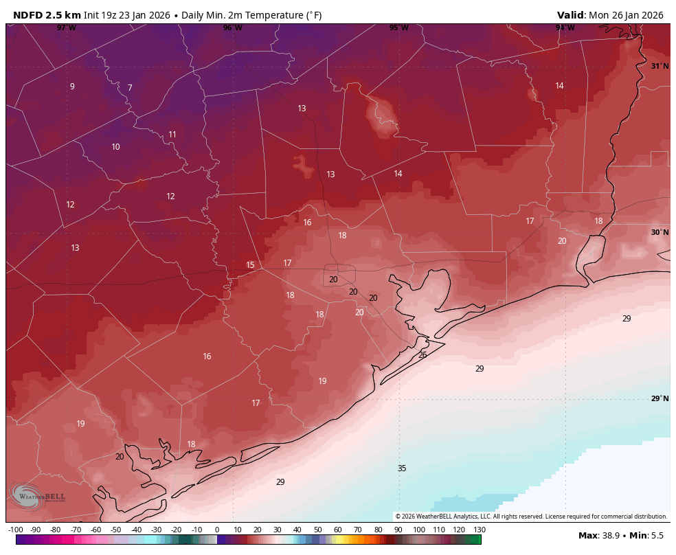 Forecasting low temperatures is difficult during winter events like this. One factor is ice. If there is a lot of it covering areas north of Houston, and within the city itself, than northerly winds moving over this ice will cool down more efficiently. This will lead to colder temperatures (possibly teens) in and around Houston. However it is also plausible that much of the city only drops to about 25 degrees. Our best advice is to prepare for the colder temperatures, and hope for “warmer” conditions.