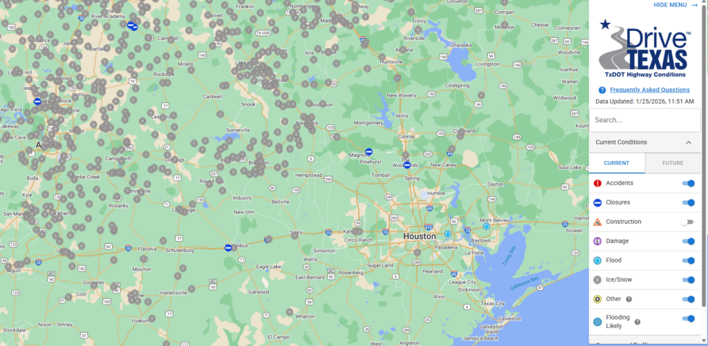 But boy oh boy, when you get outside of Houston conditions deteriorate pretty quickly. If you browse over to Drive Texas there are hundreds of reported incidences of ice and snow on Texas highways. So if you need to get from Houston north to Dallas, or west to Austin and San Antonio, travel is not recommended. (I-10 east into Louisiana is fine). Neither Austin nor Dallas will be comfortably above freezing until Tuesday, but road conditions may improve before then due to treatment.