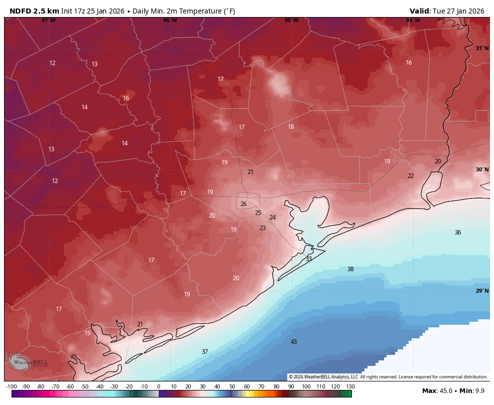 Our main remaining concern with this winter system is temperatures tonight and on Monday night, when the coldest air mass will be in place. Temperatures have trended slightly warmer of late, and I believe this is due in part to a lack of ice on the ground in and near Houston. This would have lead to more efficient cooling of air near the surface. I expect lows of generally 20 to 28 degrees in Houston on both nights, with slightly cooler temperatures possible north and west of the city. Below is a forecast for lows on Tuesday morning, which now should be the coldest of the period due to clear skies and light winds.