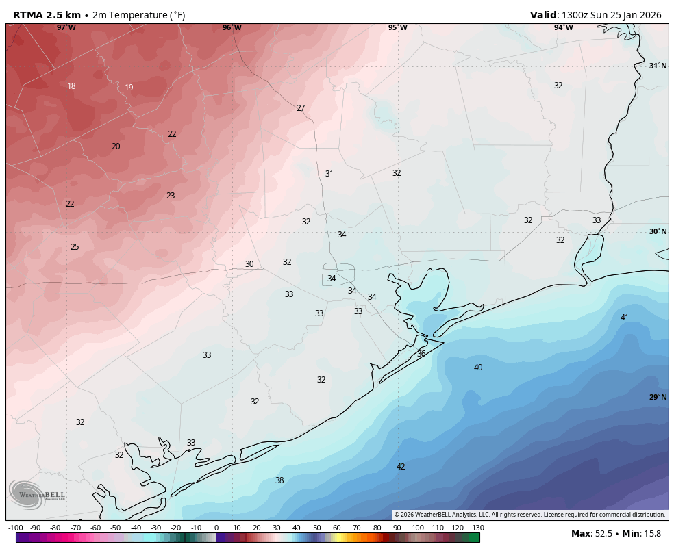 If you’ve been carefully reading Space City Weather for the past week—and you have, haven’t you?—we’ve talked ad nauseum about the uncertainty surrounding air temperatures on Sunday morning, and what that would mean for freezing rain and ice accumulations. Back on Thursday, for example, I outlined a couple of scenarios that were possible; a faster freeze and a slower freeze. In the end we got lucky, and the “slower freeze” happened.