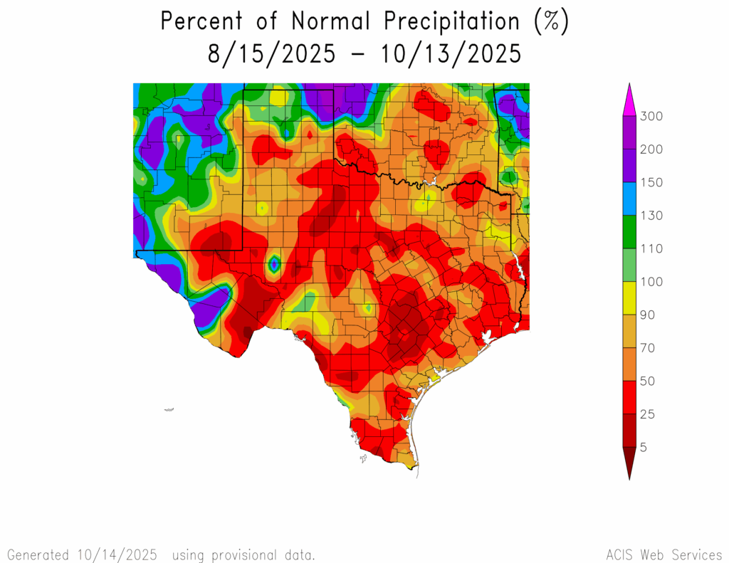 As Matt noted on Friday, drought conditions are starting to spread into the region after a dry late summer and early fall period. Houston’s official weather station at Bush Intercontinental Airport has not recorded more than a trace of rain since September 24, and in both August and September the region received substantially lower rainfall totals than normal.