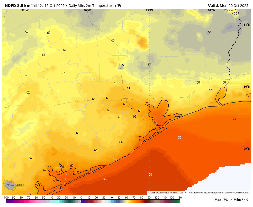We’re going to enjoy some modestly lower humidity levels for another day or so before the return of the onshore flow. Accordingly, high temperatures today will range from the upper 80s to 90 degrees today, with sunny skies. Winds will be light, from the northeast. Lows tonight will again drop into the 60s in Houston on Wednesday night, with cooler conditions in suburban and outlying areas.