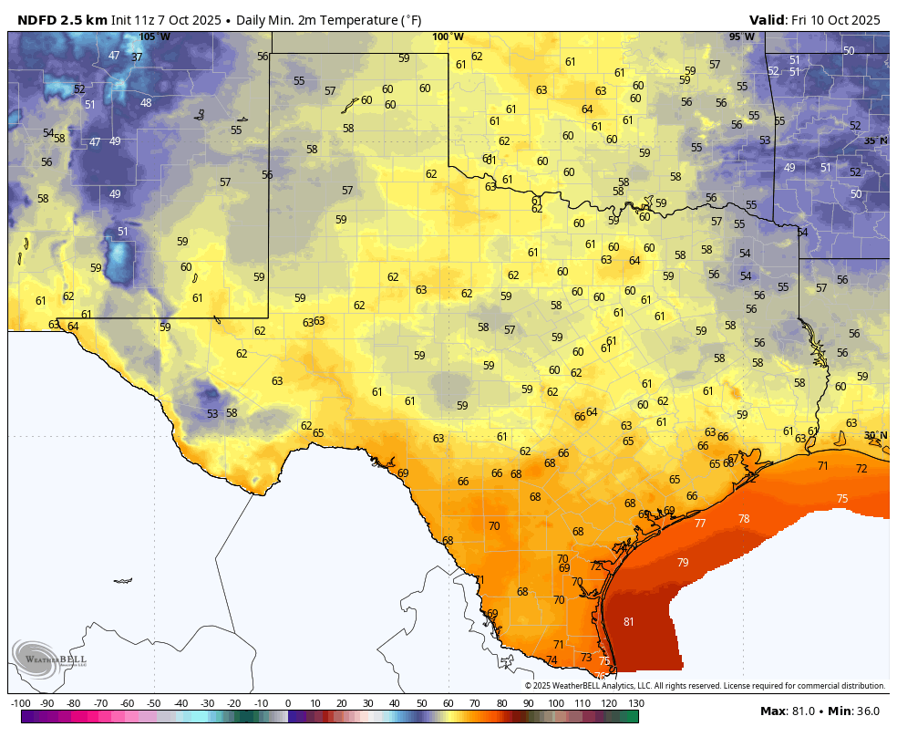 The aforementioned front arrives on Thursday, and it likely will bring no precipitation with it. However, it will usher in drier air from the northeast over time. We’ll feel that in the form of northeasterly winds on Thursday, perhaps gusting up to 20 mph. Highs will be about 90 degrees, with lows Thursday night likely dropping into the 60s (see forecast map below).