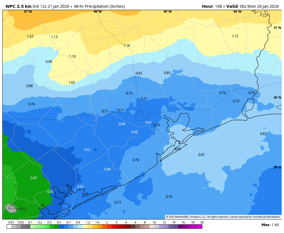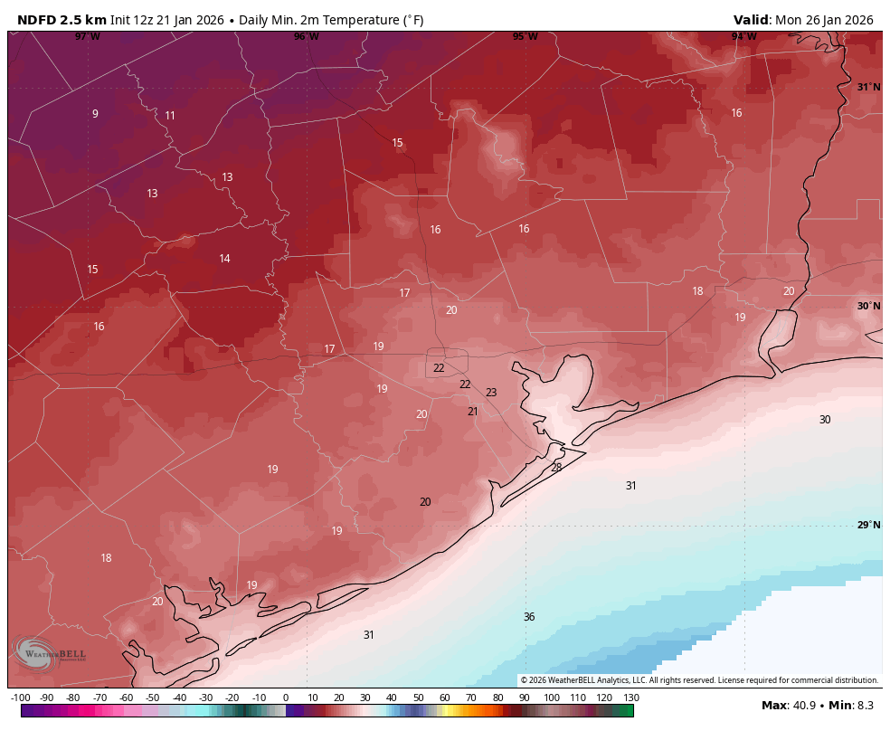 This will be a very cold day. Highs for many locations may not reach above freezing (32 degrees), or do so only briefly. My best guess is that the precipitation will exit our region some time between midnight on Saturday and noon on Sunday. Given the confluence of freezing air and moisture on roadways, I think it reasonable to expect, at a minimum, icy patches on roadways on Sunday. It could be worse, and we could have a full blown ice rink out there. But for now we can’t say for sure. The bottom line is that mobility on Sunday, even in Houston, will be a big question mark. Sunday night looks to be the coldest night of the period, with lows dropping to 20 to 25 degrees in urban parts of Houston, with cooler temperatures outside the city.