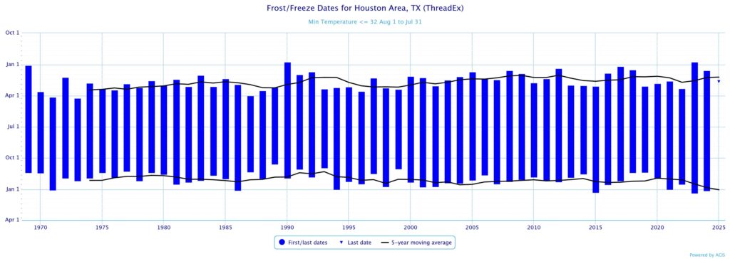 It took most of the night, but according to unofficial data this morning, the thermometer at Bush Intercontinental Airport reached 32 degrees at 6:10 am CT Monday. This is the city’s first freeze since February 20. If we look at average freeze dates, since the official monitoring station was moved to Bush airport in 1969, the average date of the first freeze is December 4. So we are a little late this year, but not too late.