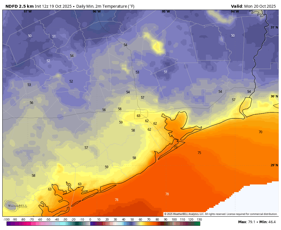 Most of the region has yet to see a night in the 50s so far this season, (our coolest night came on October 11, with 61 degrees at Bush Intercontinental Airport) but that is in the cards on Sunday night. Areas outside of Houston’s urban core, and away from the immediate coast, should drop into the mid-50s tonight as drier air descends into the region today.