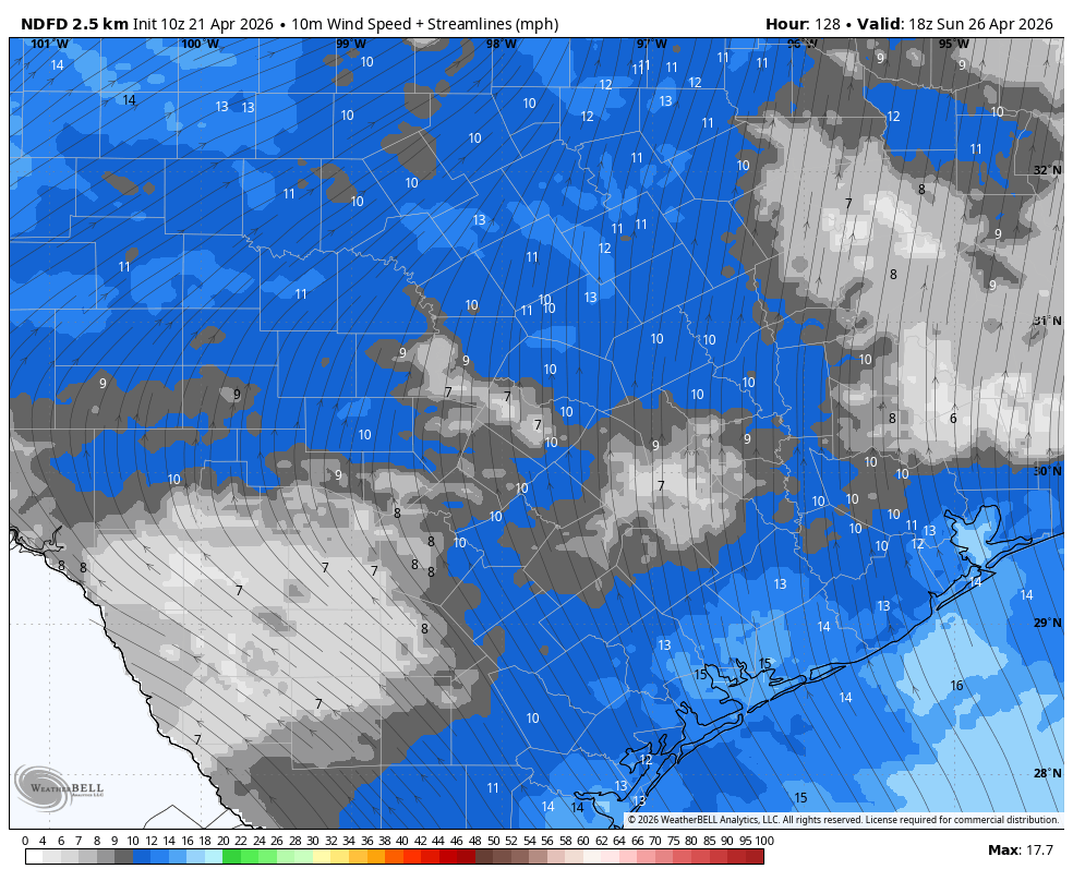 So what about winds? If you’re participating in the MS 150 ride this weekend that’s what really matters. The route on Saturday is generally westerly, and then it turns more northerly on Sunday. Winds at dawn on Saturday will be mostly southerly, at about 5 mph, so a cross wind. They’ll be stronger by the middle of the day, 10 mph with gusts up to 20 mph. The story will be similar on Sunday, so more of a pure tail wind that day. You should be flying that day!