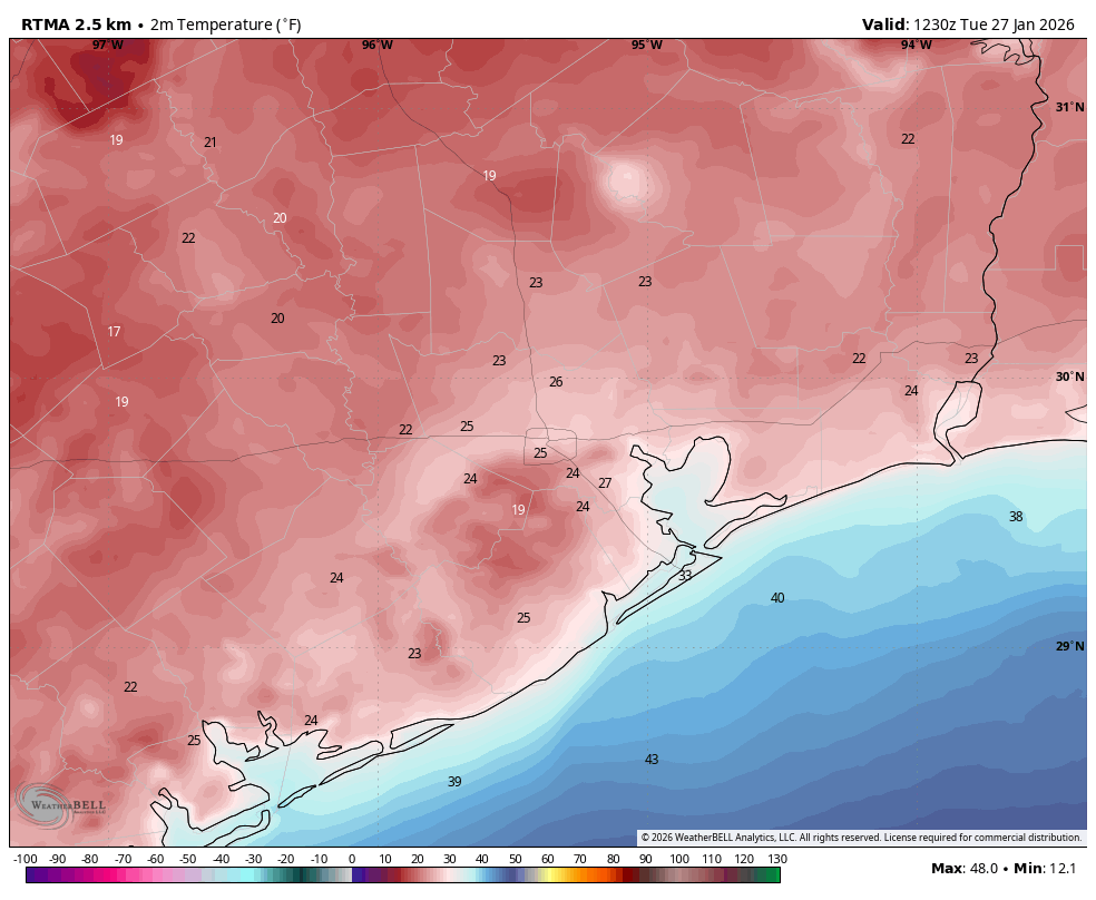 We are at the tail end of impacts from this past weekend’s Arctic front, but paradoxically we are also seeing the coldest temperatures of the event, ranging from 18 degrees in Conroe to the low- to mid-20s across much of the Houston region. We’ve waited this long for the coldest air because skies finally cleared last night, and winds died down to nearly zero. This created ideal conditions for cooling temperatures. However we also will see a fairly quick rebound in conditions today, with sunny skies leading to highs of around 50 degrees.