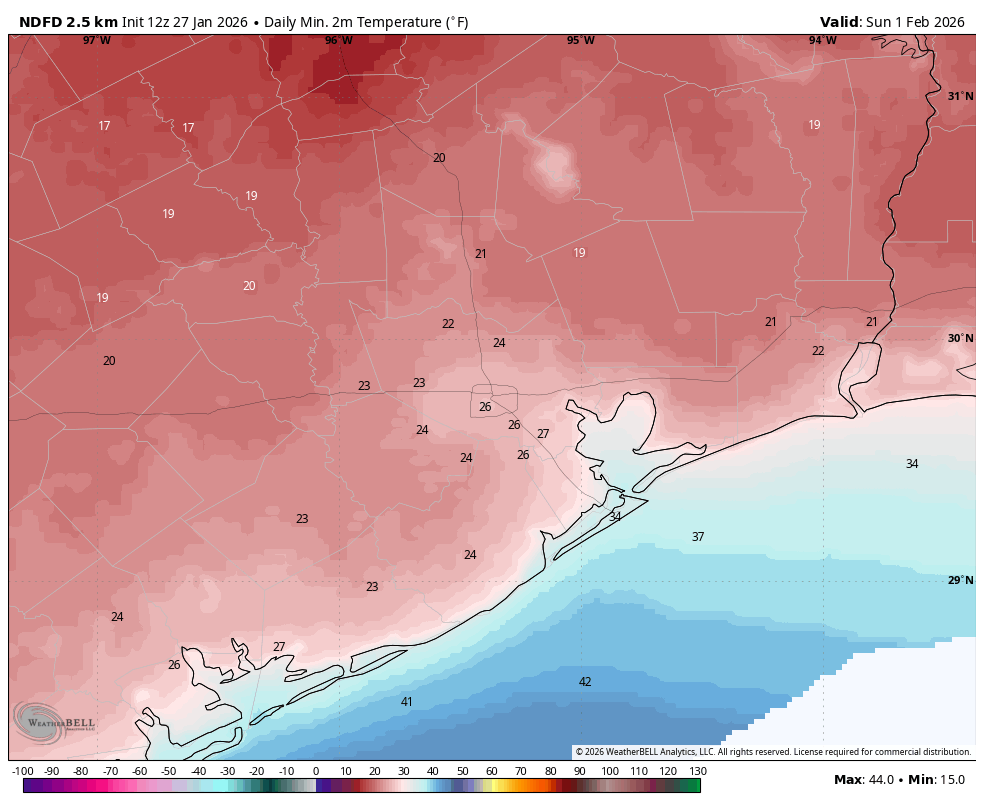 The weekend looks mostly sunny and cold. Highs on Friday will probably reach about 50 degrees, but Saturday will be colder, perhaps only in the low 40s as cold air continues to advect into the area. Sunday may be slightly warmer. So what about nighttime temperatures? Friday and Saturday night look to be the coldest. There’s the potential for a hard freeze on Saturday night, when we once again see ideal cooling conditions. Right now I would predict lows between 25 and 30 degrees in urban Houston, with slightly cooler conditions for outlying areas. But we will see.