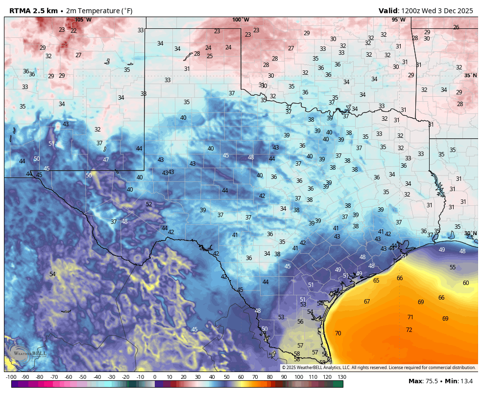 We probably will start next week with days in the 60s and lows in the 40s, warming to 70s and 50s for the second half of the week. Rainfall potential looks low. I’m not seeing much in the way of inclement weather, so all in all it looks like a rather nice week of December weather.