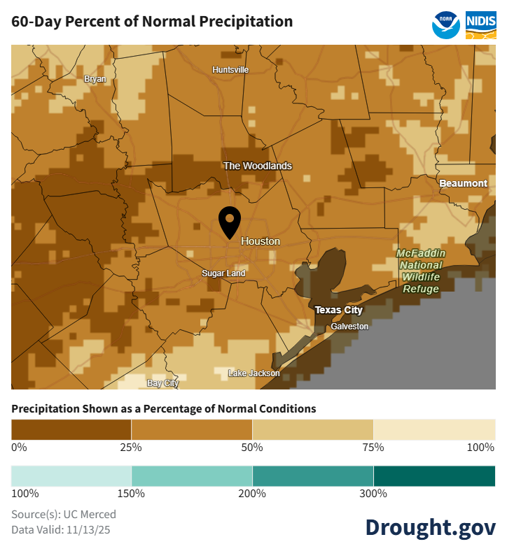 During the last 60 days most of the Houston region has received 10 to 50 percent of normal precipitation.