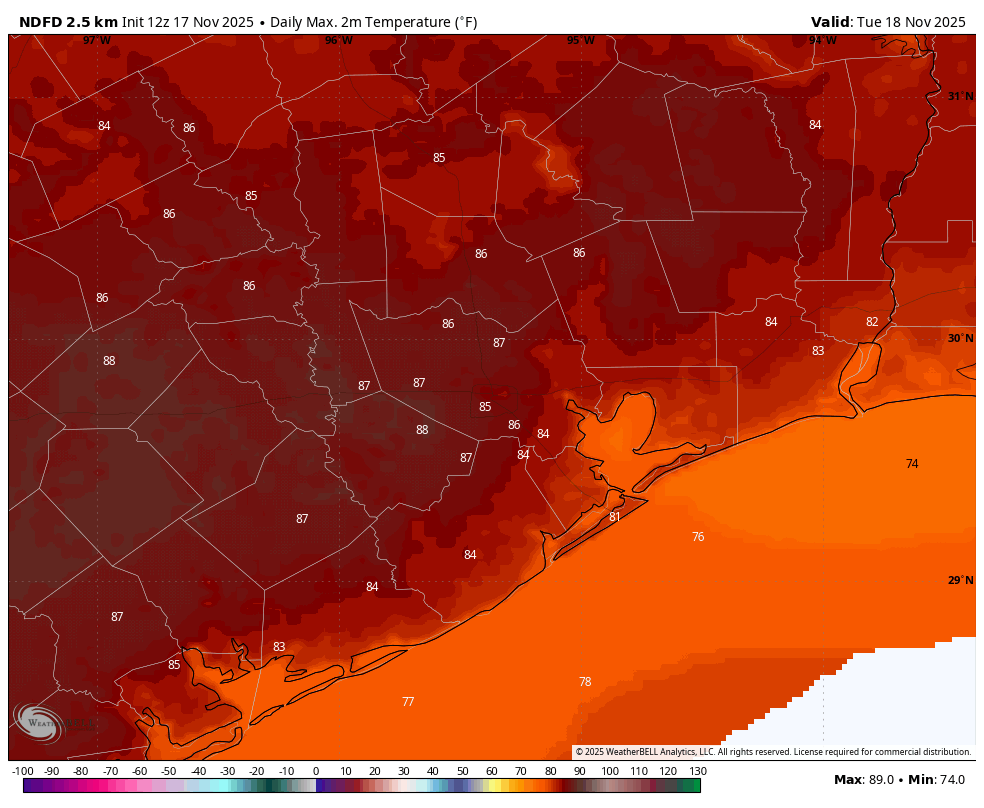 In brief: In today’s post we discuss record heat in November, with a couple of days this week likely breaking high temperature marks. Houston is also going to finally see some meaningful rainfall this week, likely beginning on Thursday, ahead of a front.