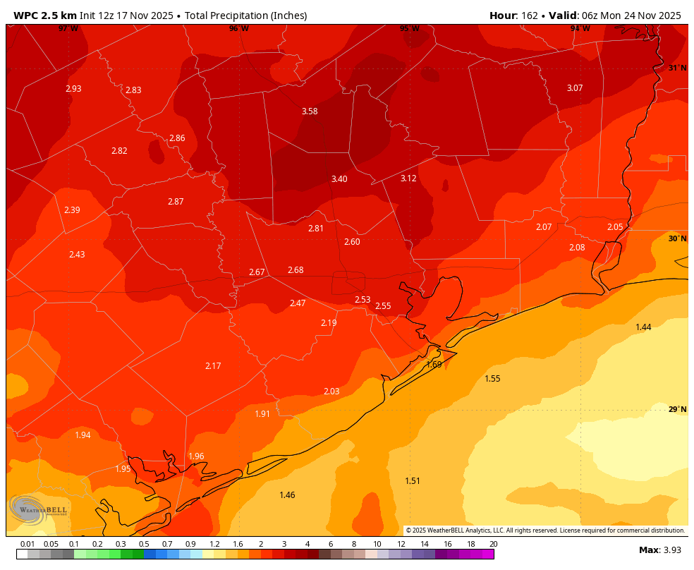 Our weather this weekend will depend on the strength of the front, and there remains some question on just how much cooler and drier air will reach Houston. I think there will be a decent amount, but we shall see. For now let’s go with highs in the 70s and lows on Saturday and Sunday night in the 50s, with lower humidity. I also think both days will continue to see a decent chance of rain showers, but again this will depend on where and when the front stalls. So the bottom line is that our forecast for this weekend is uncertain: could be mildly warm and rainier, or a little cooler with less rainfall. Stay tuned. In terms of rainfall accumulations I expect most of the region to pick up 1 to 4 inches through Sunday.