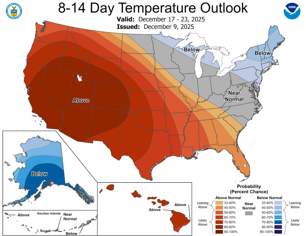 In brief: In today’s post we discuss a warmup in our weather through Saturday, followed by a short but sharp cold front on Sunday. We also spend some time talking about how the week before Christmas is likely to bring warmer-than-normal weather.