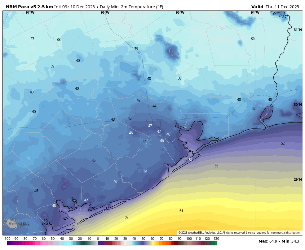 Temperatures this morning are generally in the mid- to upper-40s across Houston, with clear skies (it’s a beautiful sunrise, I must say). We are going to warm nicely this afternoon, into the low 70s for the most part. We would be well on our way to a significant warming trend, but for the fact that a reinforcing front will arrive today, with light winds shifting to come from the north this afternoon. This cooler air will allow temperatures to drop into the 40s tonight, with a few outlying areas possibly returning to the upper 30s. I don’t expect any rain, or possibly even any clouds, to accompany the front.