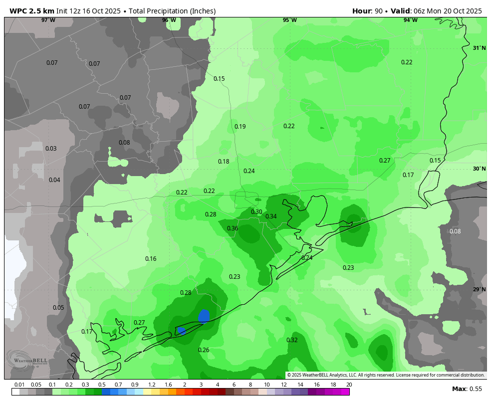 This is the day when a cool front will approach and (probably!) move through Houston and down to the coast. The European (and other) models remain fairly bullish on a nose of drier air dropping down into Houston on Sunday, but there is some uncertainty. Basically, I think if you live along and north of Interstate 10, you’re going to see a good shot of less humid air for a day or so, and but the closer one lives to the coast, the lower the chances and the less dry air. In short this is not going to be a strong front that barrels off the coast and leaves us all saying, “Ahhh.” With that said, most of Houston will probably see highs in the upper 80s on Sunday with lower humidity and sunny skies. Temperatures on Sunday night will vary widely, with some inland areas probably dropping into the 50s, but the coast remaining stubbornly in the 70s.